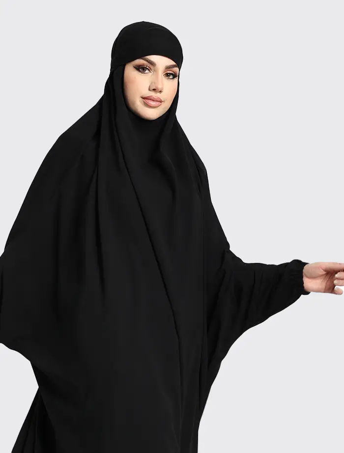 This half-jilbab set is thoughtfully designed with a chin-covering style and a tie-back headband for a secure and comfortable fit. The elasticated cuffs make performing wudhu easy and convenient, while the slightly flared skirt features an elasticated waistband to ensure a flexible fit for sizes 8 to 16. Sold as a free-size set, this khimar offers both modesty and ease for everyday wear.