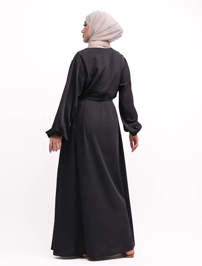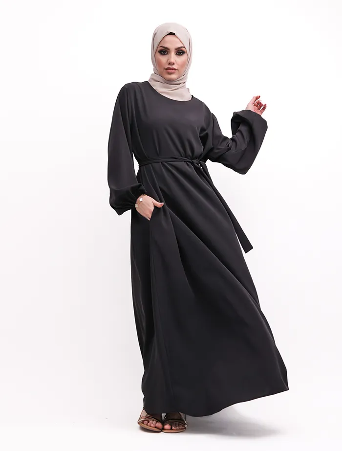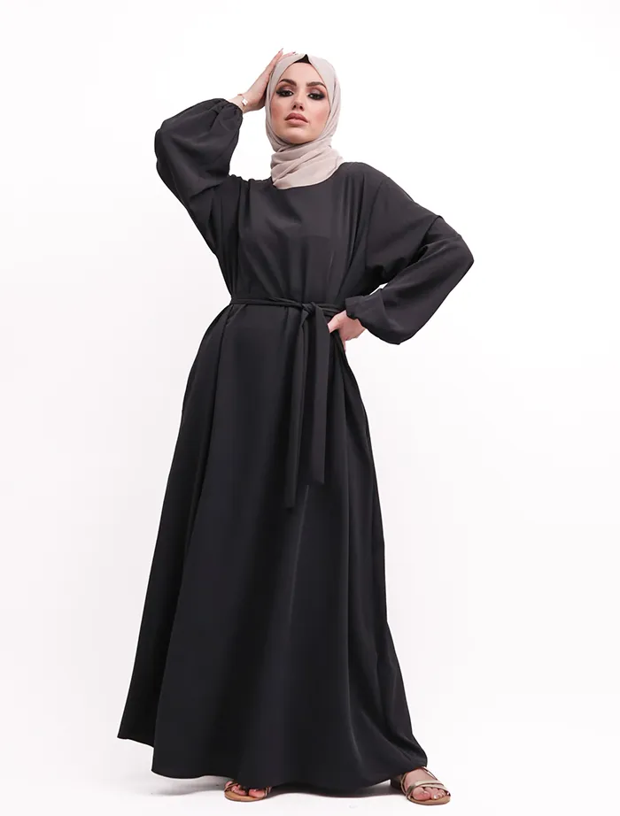 Another basic abaya which you can’t go wrong with, although simple it will meet your expectations for your everyday comfort. This dress features an A-line cut flared bottom with pockets on both sides for your essentials, elasticated cuffs to give a slight puff look. A separate belt is included to give a more structured look or you can just opt for the more casual look without it.