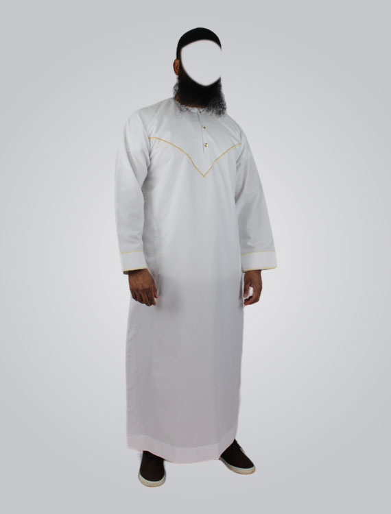The thobe is a traditional Middle Eastern garment worn by men. It is a long, loose-fitting robe and features long sleeves. Golden string at chest and back adds a unique look to the thobe.