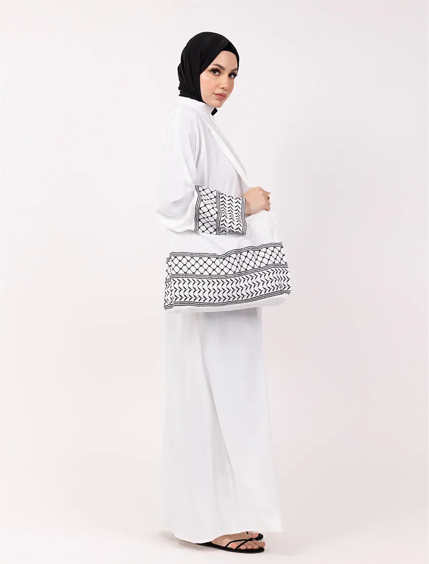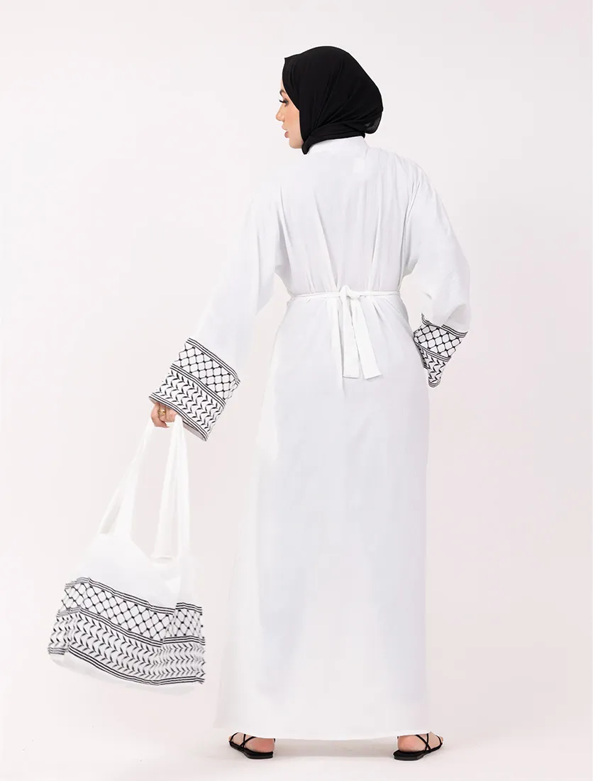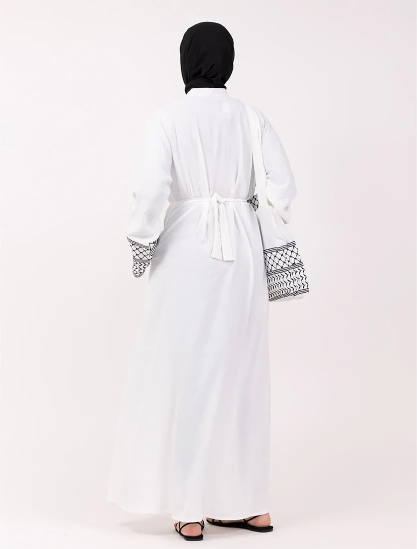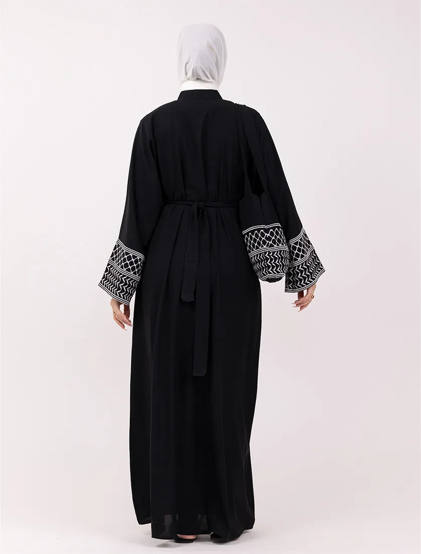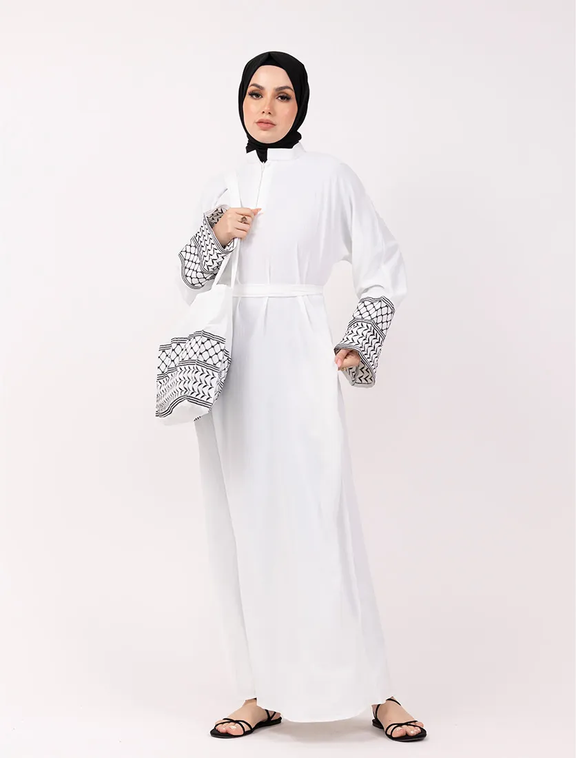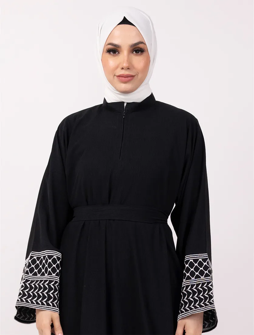 Inspired by the traditional Middle Eastern keffiyeh headscarf. Featuring a round neckline with a single button opening. This abaya although simple will meet your expectations for your everyday comfort. This dress features an A-line cut flared bottom with zip pockets on both sides for your essentials.