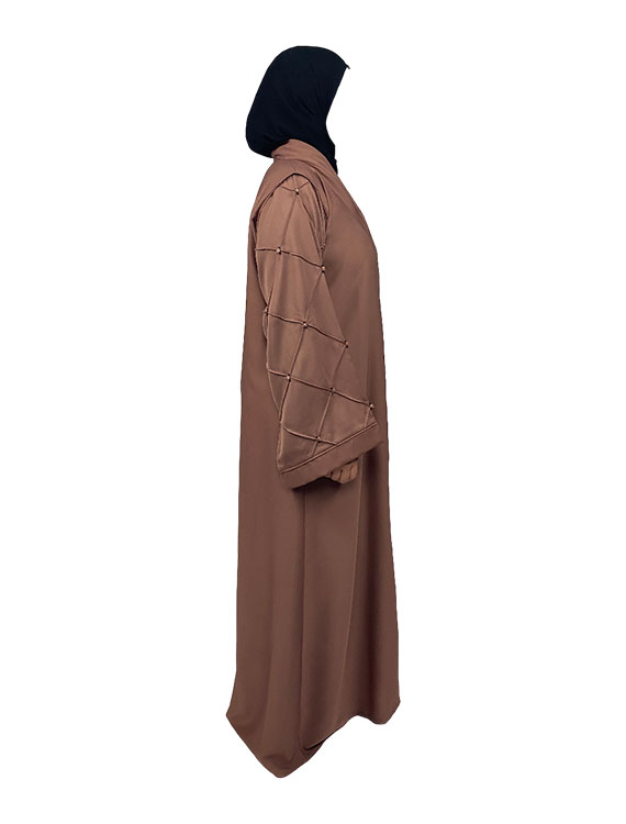 Front open khaki abaya with buttons are pulled over the head and fastened closed, front open abayas have buttons on the front.