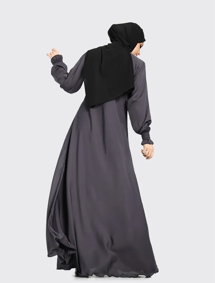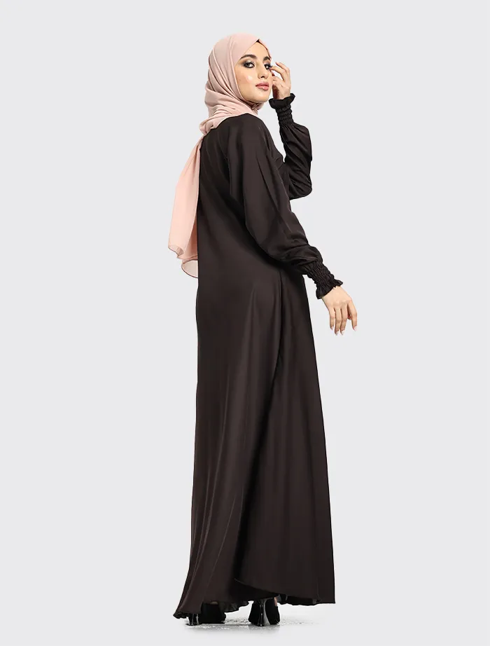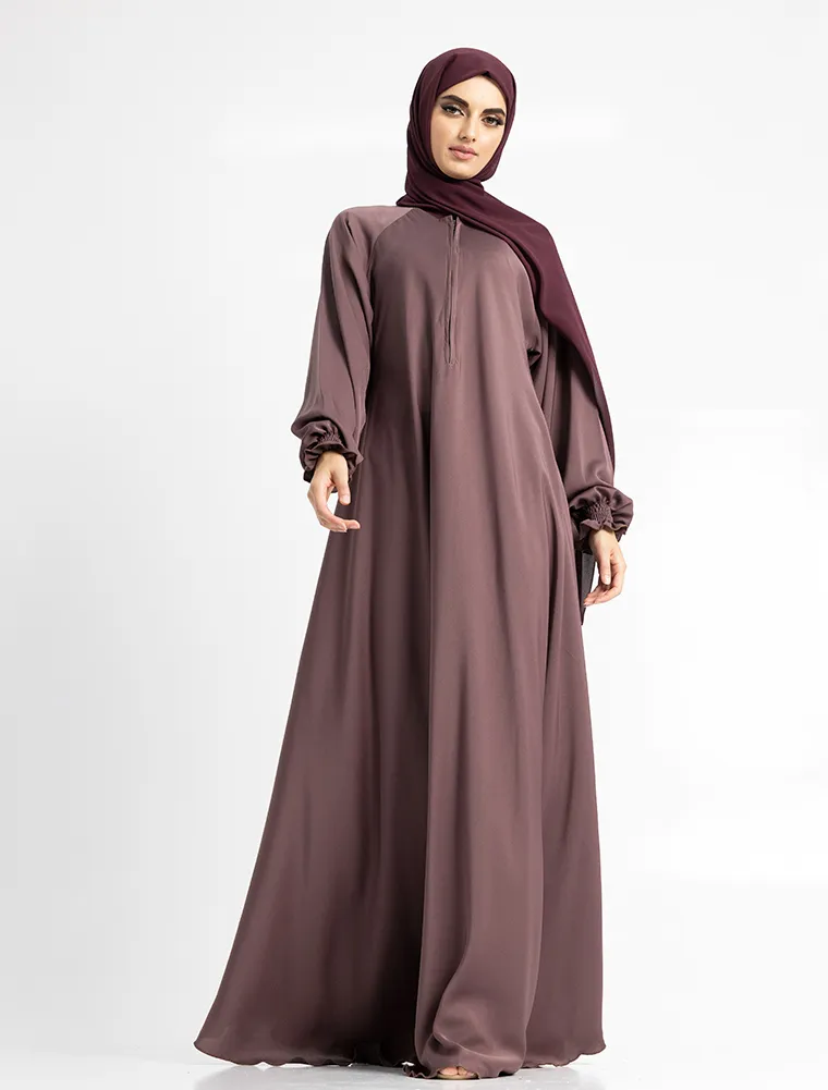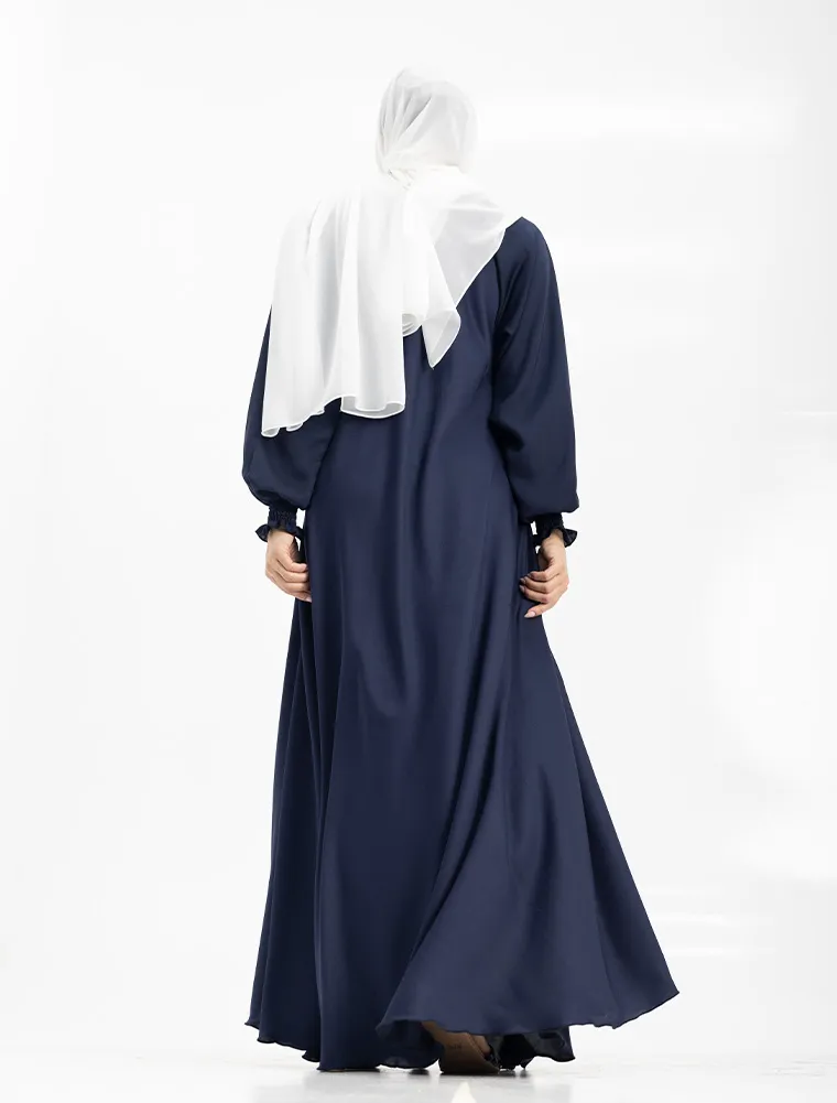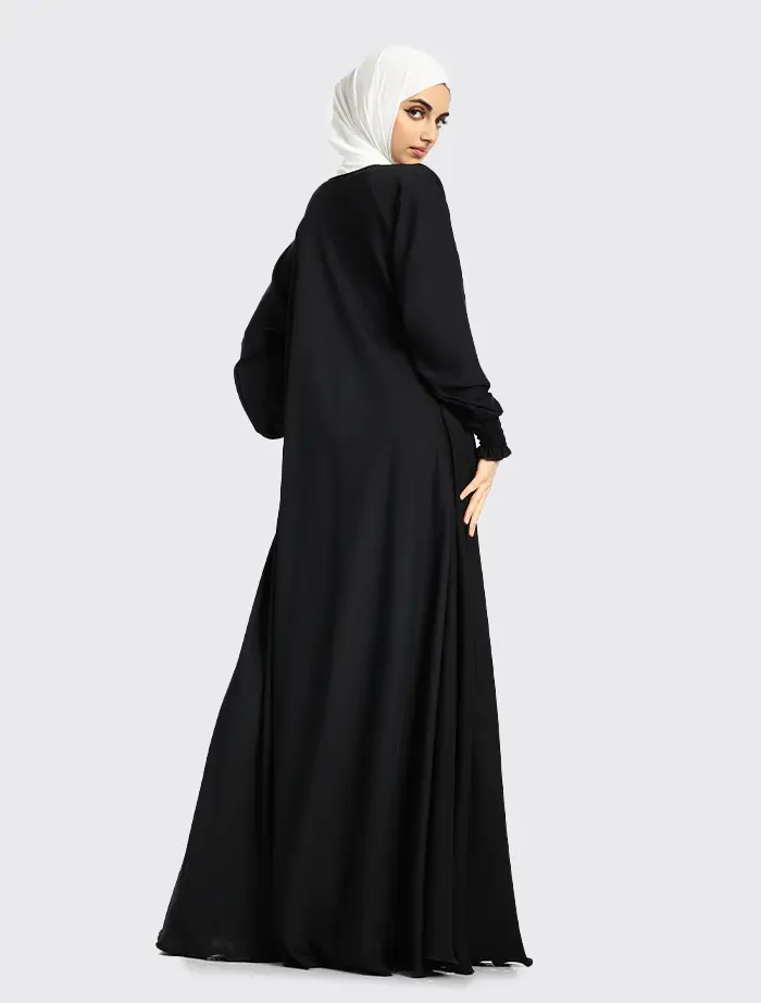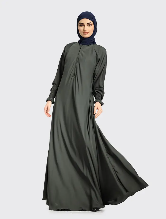 Crafted from premium Nida fabric, this abaya features a full-flare umbrella cut that offers both elegance and comfort. The round neckline is complemented by a concealed front zip for ease of wear, while the sleeves are finished with elasticated cuffs for a modest yet practical touch. Perfect for maternity and everyday wear, this abaya combines effortless style with everyday functionality.
