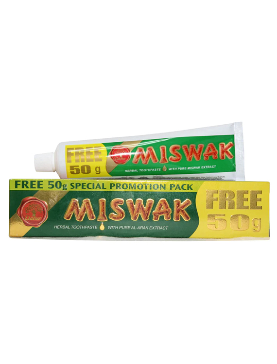 Miswak Herbal Toothpaste is a natural and herbal toothpaste that is formulated with miswak extract and other natural ingredients such as clove, fennel, and mint. Miswak is known for its anti-bacterial properties and is an effective way to clean teeth and freshen breath. The natural herbs in this toothpaste work together to provide a deep clean and help prevent cavities and gum disease. It is free from harsh chemicals like fluoride, SLS, and parabens, making it a safe and healthy alternative to conventional toothpaste. Miswak Herbal Toothpaste is suitable for all ages and can help promote healthy teeth and gums with regular use.