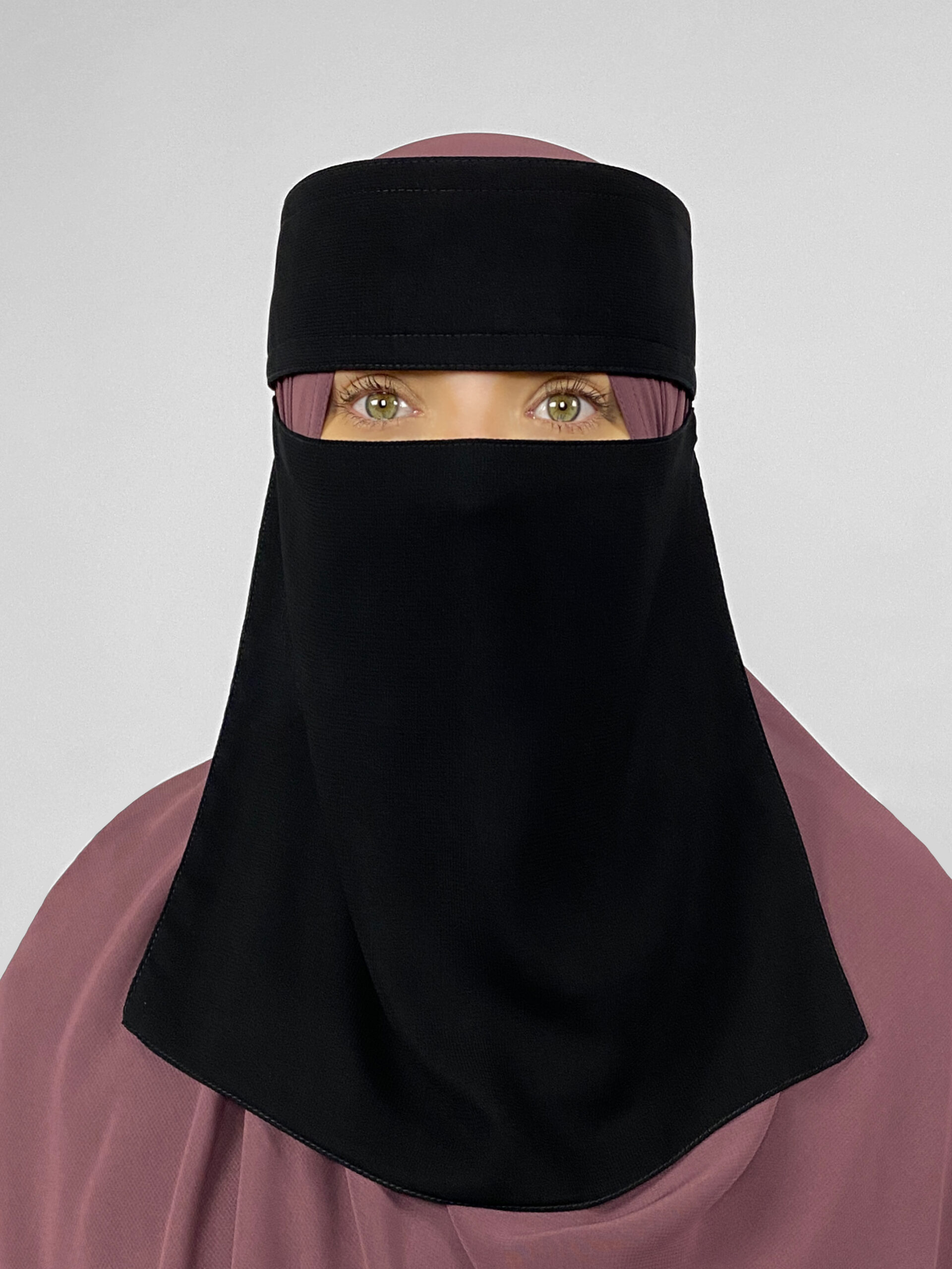 This is our Short 1 Layer Niqab which measures 10 inches in length. This length is a favourite for many ukhtis because it provides air-flow, is easy to eat with, and great if you have to follow strict health and safety requirements at work.