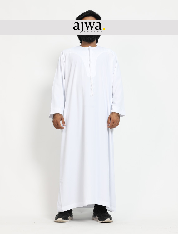 This Ajwa London’s Mens Jubba Thobe is made of soft and breathable cotton material. With a collarless design and a zip front center, it offers a professional and modern look. It also features two pockets for added practicality. The sizes range from 52 to 60, with every size measuring two inches apart in length and width. Made with 70% polyester and 30% viscose, this thobe is both durable and comfortable for everyday wear.