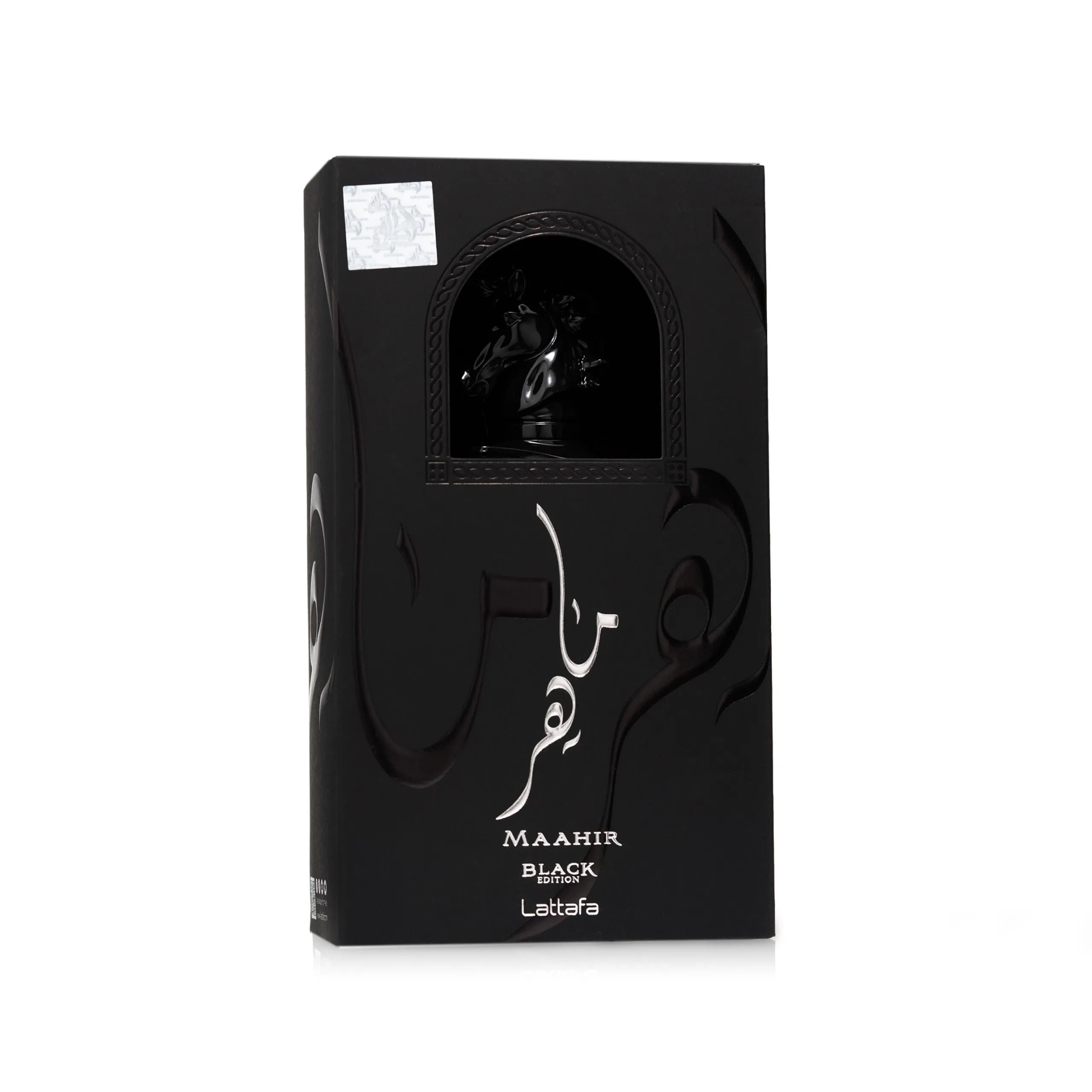 Maahir Black Edition by Lattafa Perfumes is a Amber Spicy fragrance for women and men. Maahir Black Edition was launched in 2019. Top notes are Black Pepper, Pink Pepper and Saffron; middle notes are Labdanum, Cade oil, Gurjan balsam and Rhubarb; base notes are Leather, Cedar, Patchouli, Guaiac Wood, Musk and Moss.